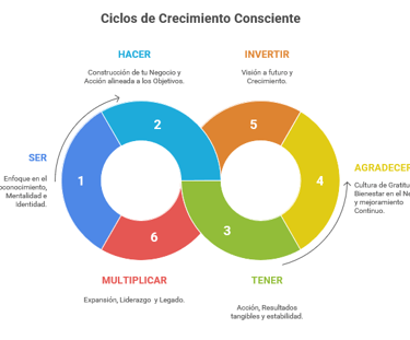 Usamos una metodología propia de 6 ciclos de crecimiento consciente, en donde cada etapa responde a desafíos reales del negocio y del liderazgo.